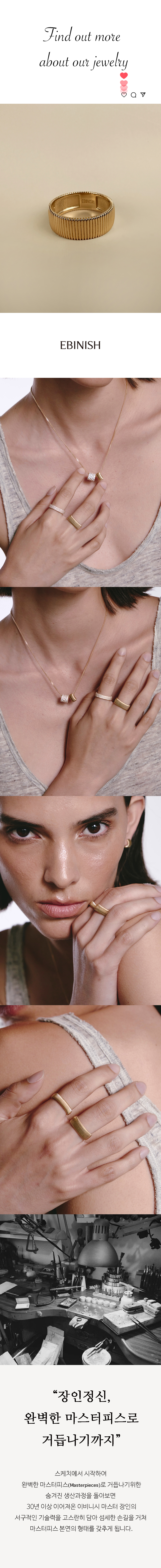 이비니시 리비드 컬렉션은 입체적인 각도와 정교한 라인이 만들어내는 클래식함이 시선을 사로잡습니다. 밴드 라인을 따라 정교하게 패턴화된 밴드 링은 남녀 모두 착용할 수 있으며 이비니시를 대표하는 클래식 링입니다.