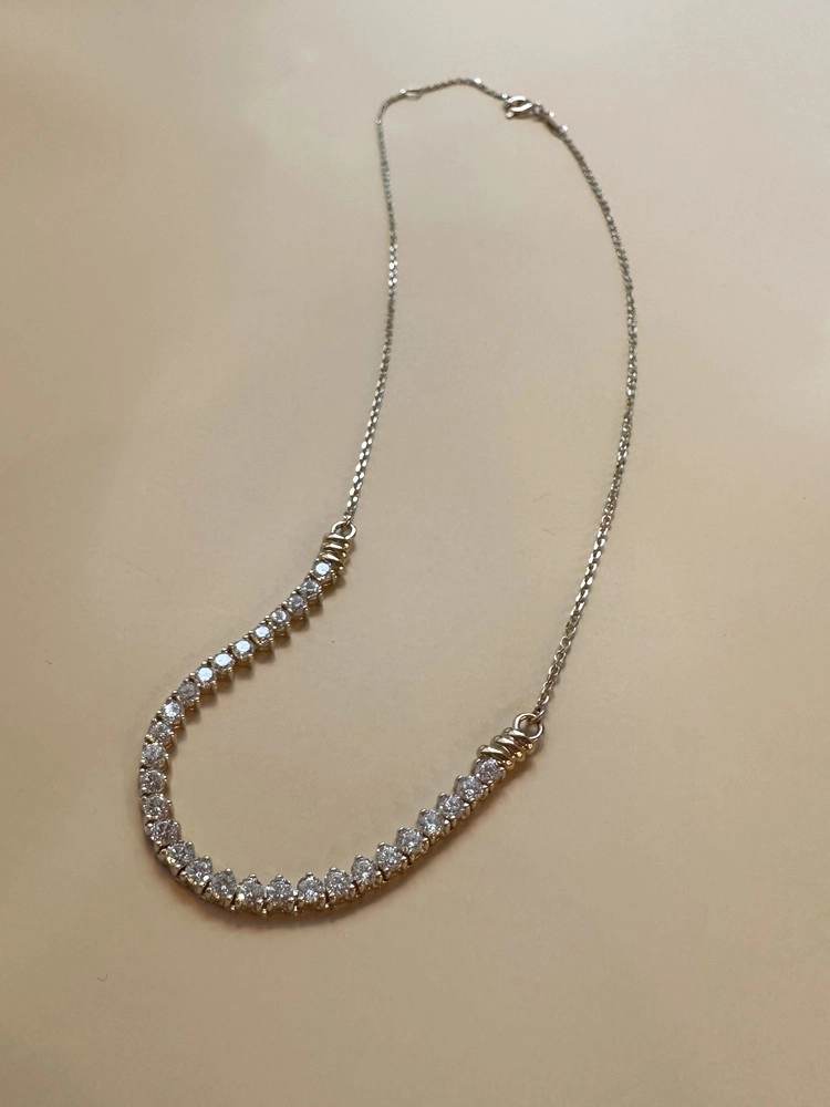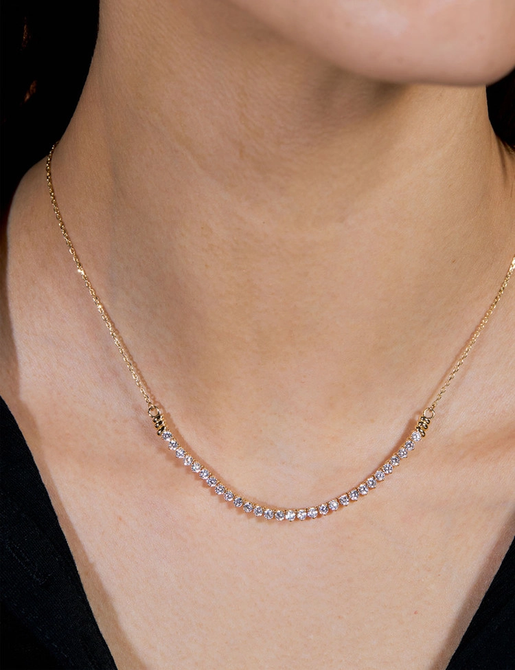 Boasting elegant curves, the 'returnto vintage half tennis' necklace boasts modern and timeless beauty. This necklace hang over your neck in perfect proportion and are decorated with unfashionable classicality and brilliantly shining diamonds.