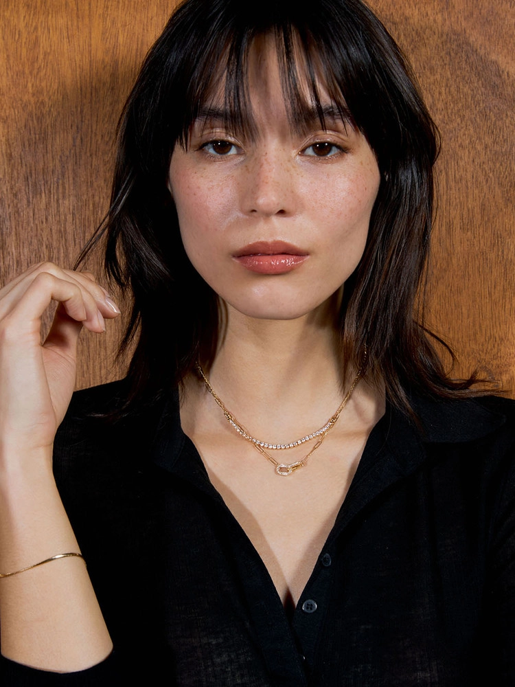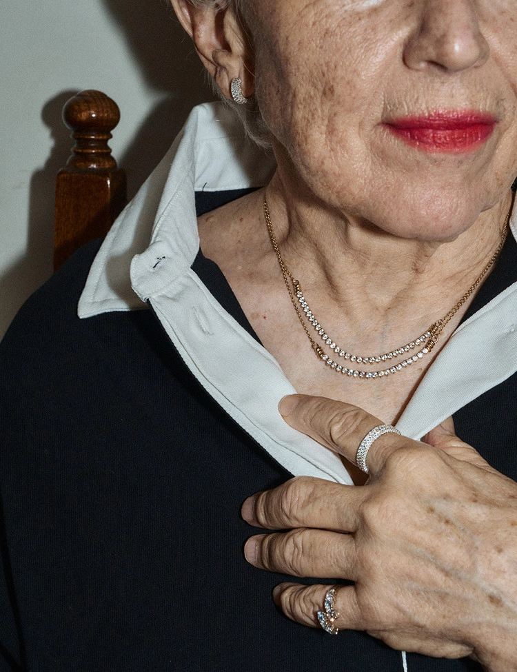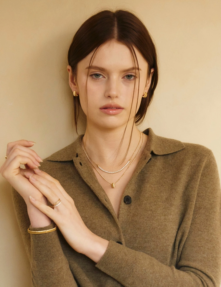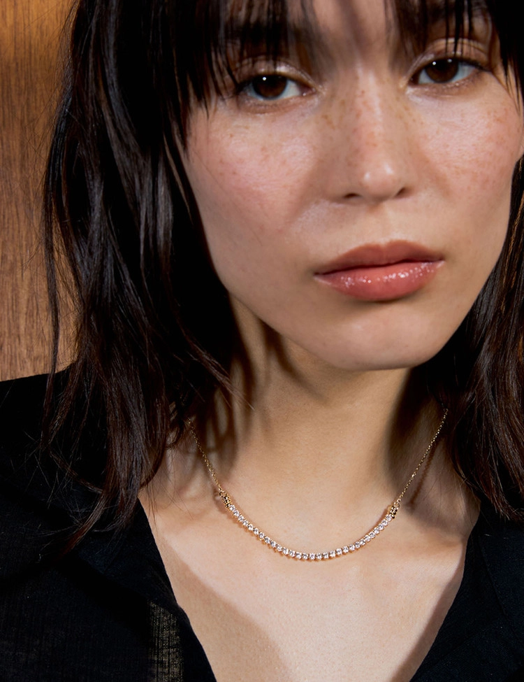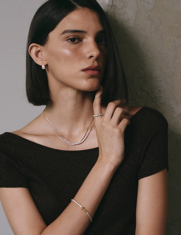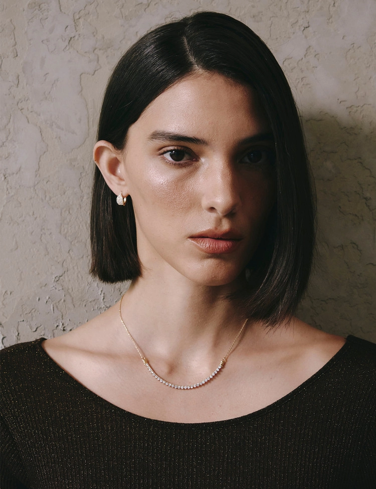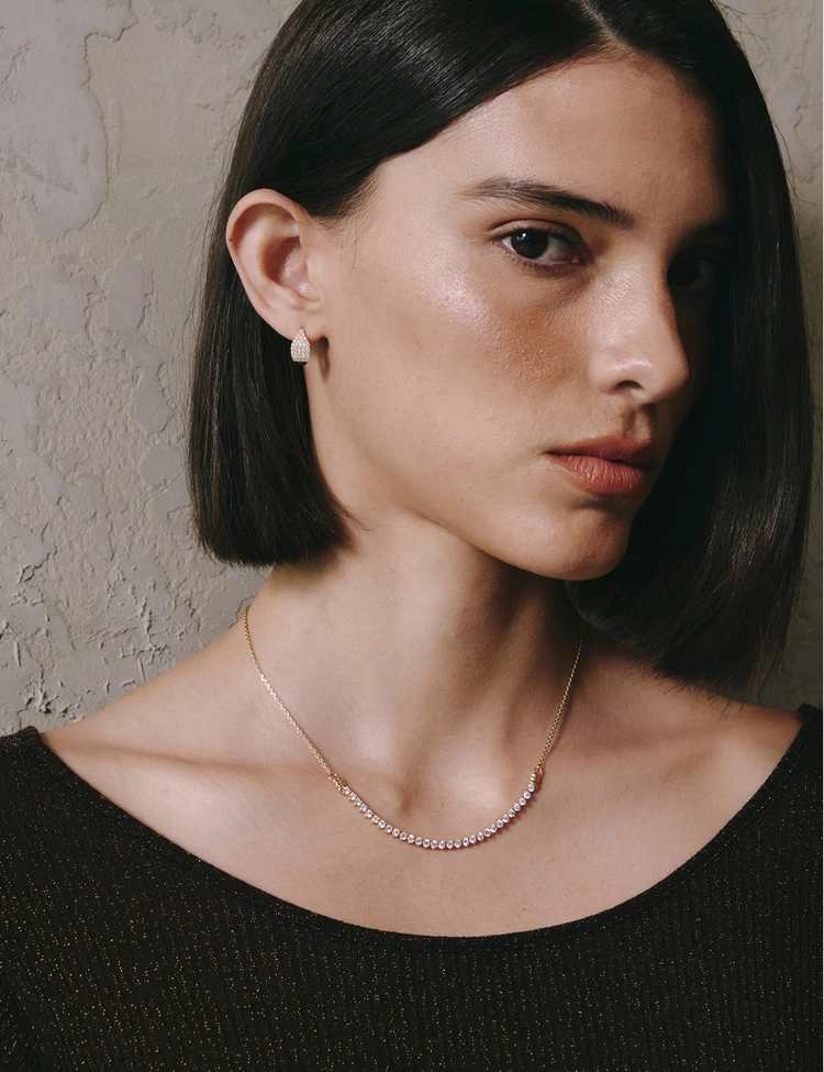 우아한 곡선을 자랑하는 리턴투 빈티지 하프 테니스 네크리스는 모던하면서도 시대를 초월한 아름다움을 자랑합니다. 이 네크리스는 완벽한 비율로 목 위에 드리워지며 유행을 타지 않는 클래식함과 영롱하게 빛나는 스톤이 화려하게 장식합니다.