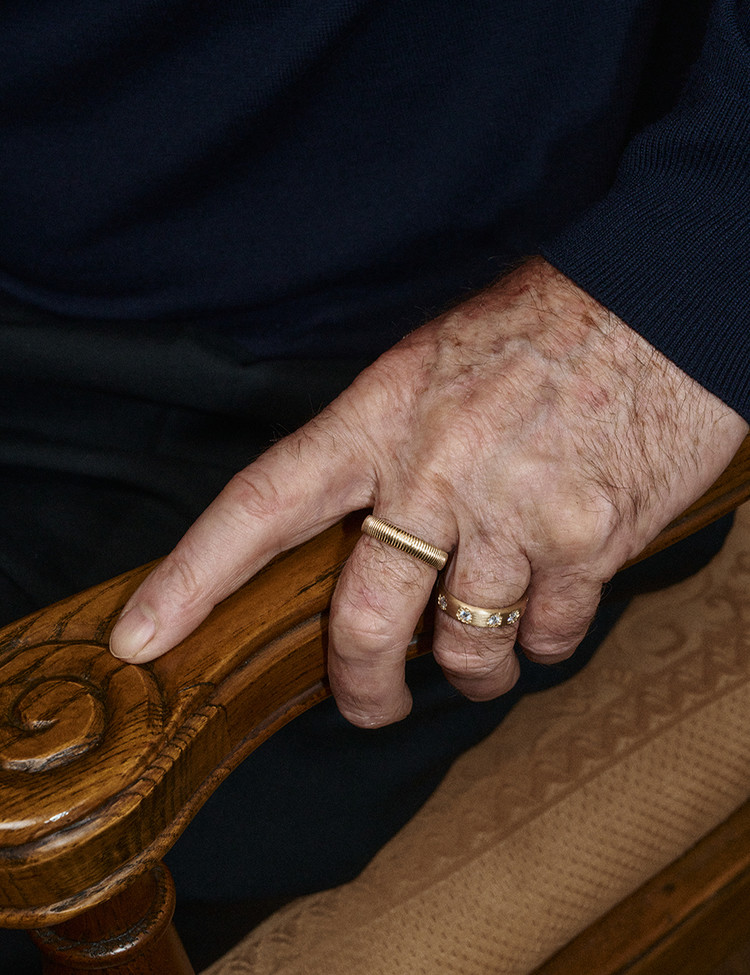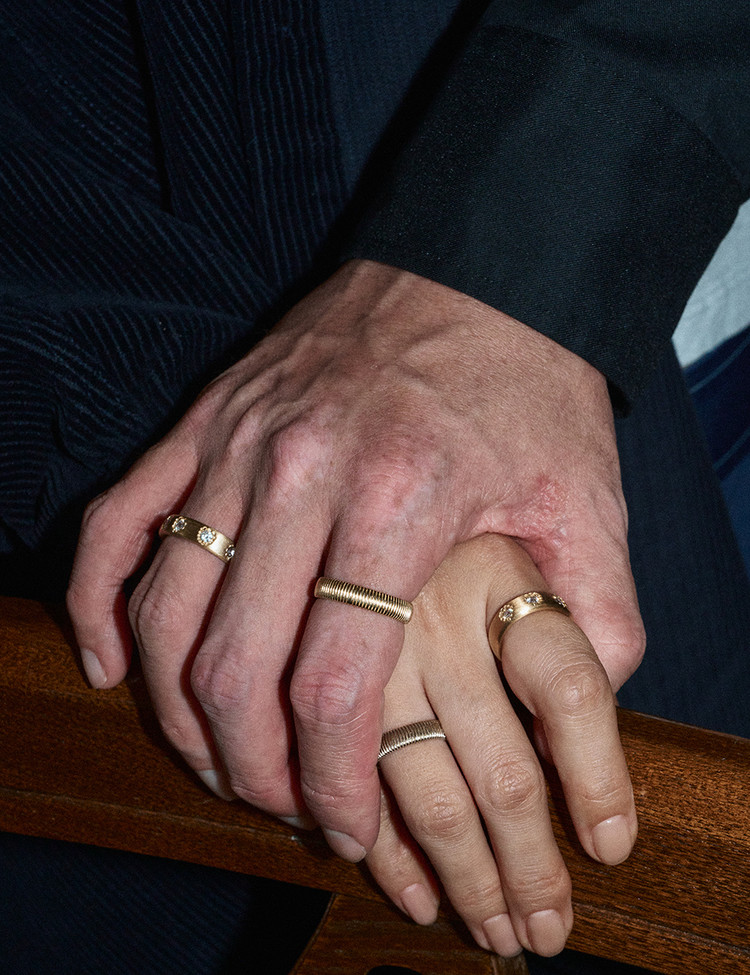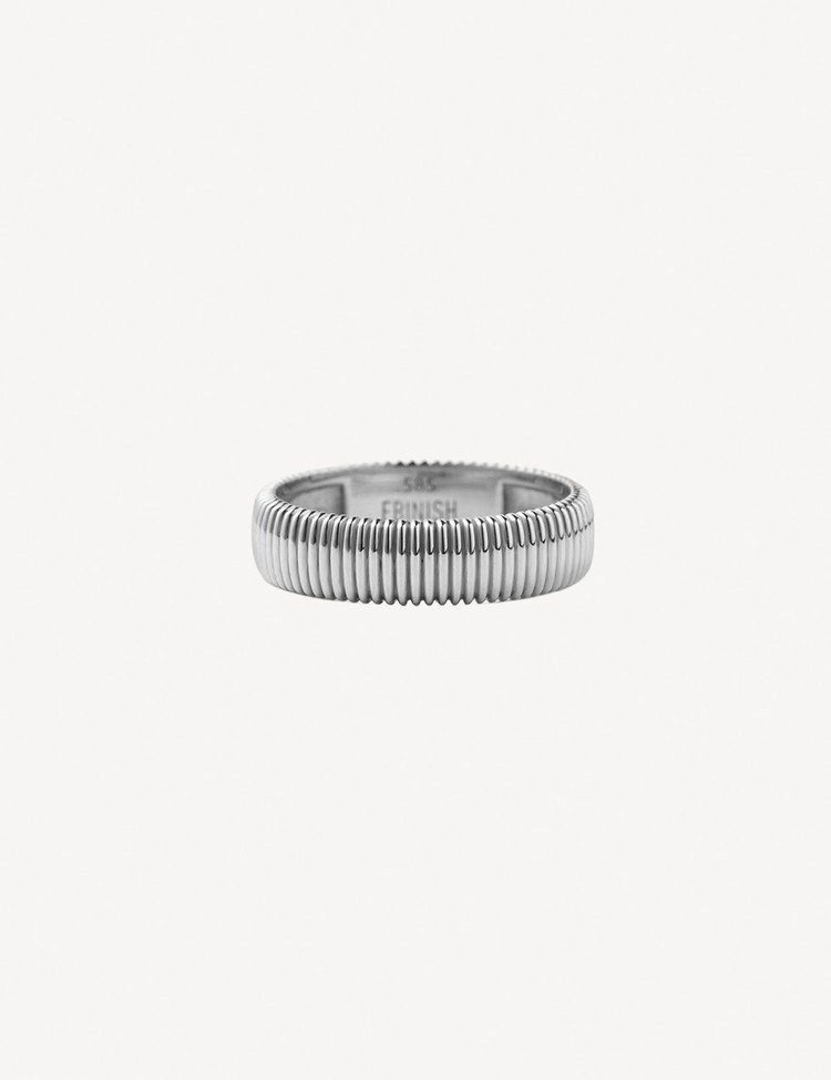EBINISH 'ribbed' Collection catches the eye with the classicality created by its three-dimensional angles and elaborate lines. Elaborately patterned band rings along the band line complete the perfect pairing with the EBINISH 'Liberty' ring. It is a classic ring that can be worn by both men and women and is representative of EBINISH.