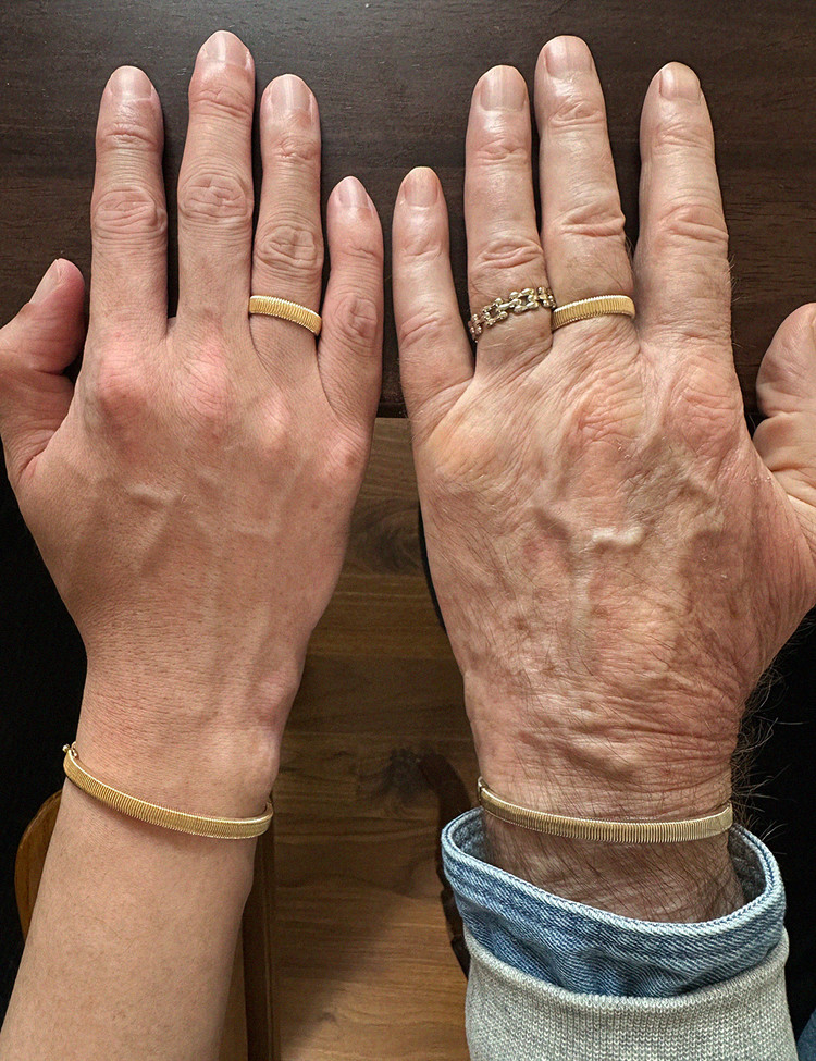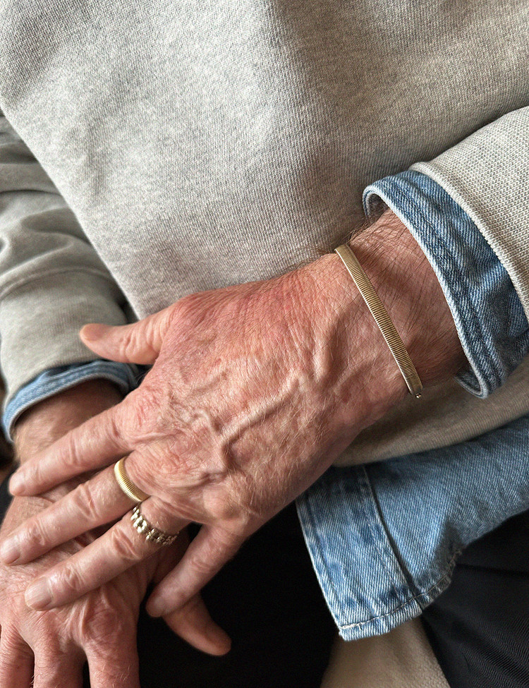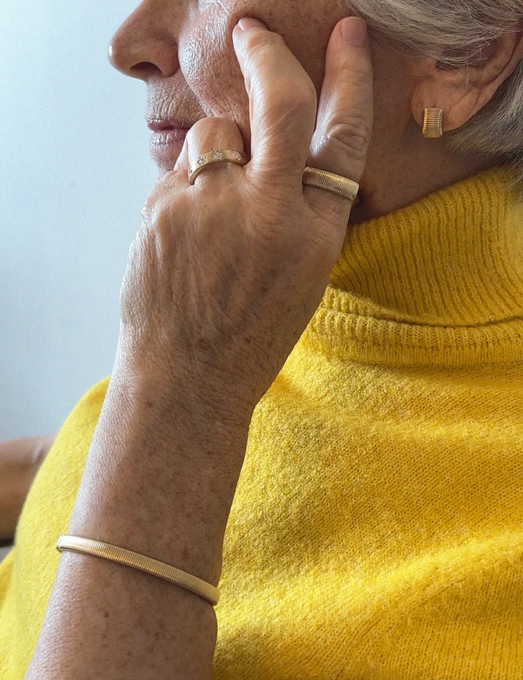 The ribbed bangle, which beautifully blends classic and contemporary styles, is part of the EBINISH 'Ribbed' collection. It features a double-lock clasp and hinge mechanism for easy wear, making it a timeless statement piece. We recommend pairing it with other EBINISH bangles, bracelets, or watches to create a stylish stacked look.
