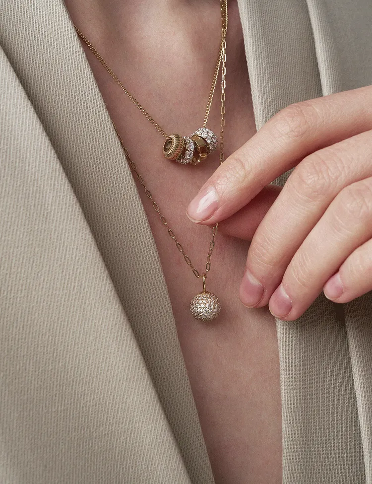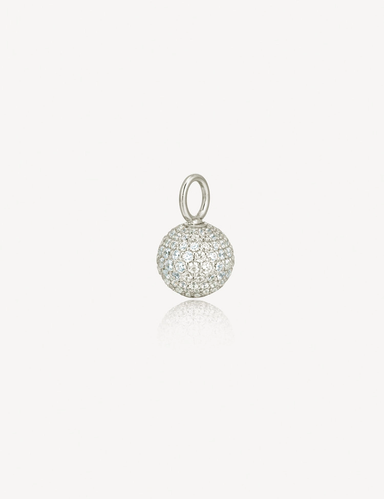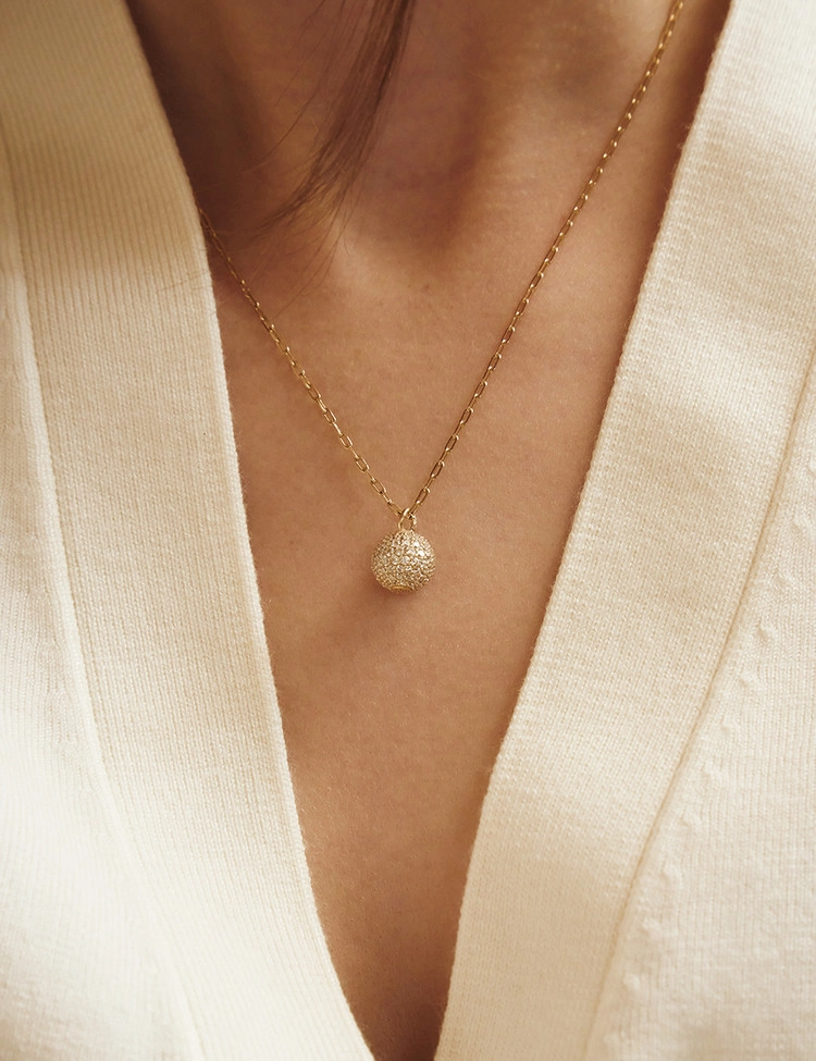 The necklace is crafted with offset pavé settings of stones in varying sizes, emphasizing the center of the sphere.