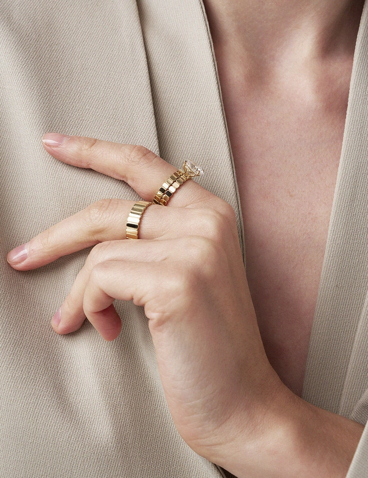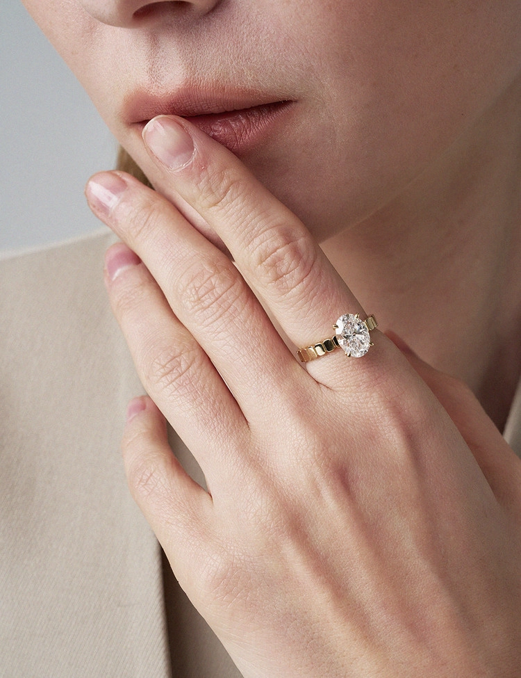 Featuring a radiant 2-carat oval-cut lab-grown diamond, this fancy cocktail ring showcases the signature square-edge band design of the Rotor Collection, creating a spectacular display of light from every angle. With a silhouette that’s slimmer and lighter than the Rotor Oval 2-Carat Wide Ring, it offers versatile styling from daily wear to formal moods. This piece is certified by the International Gemological Institute (IGI) and is part of the EBINISH Rotor Collection.