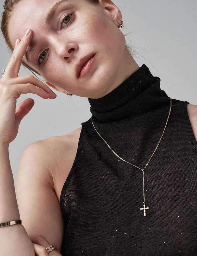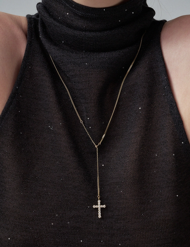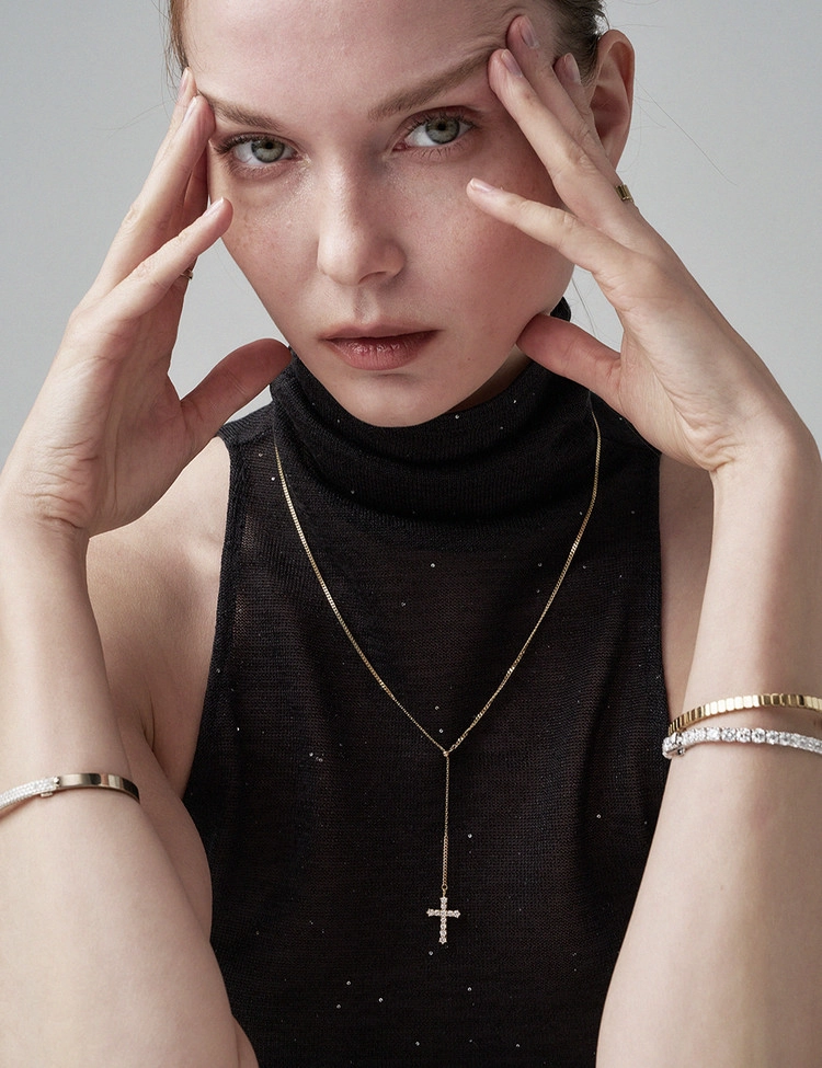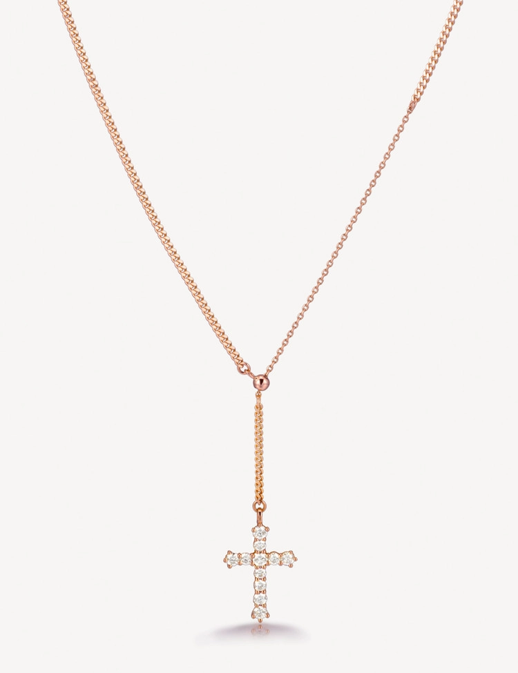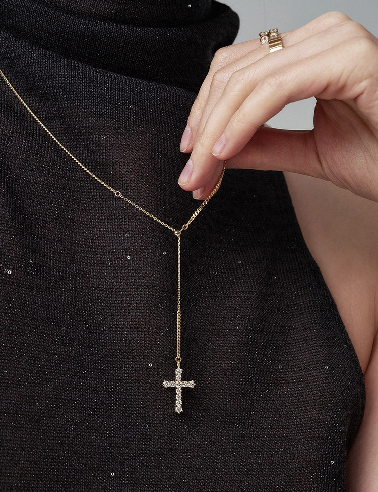 클래식한 십자가 라인을 따라 세팅된 11개의 2.5mm 안밖 라운드 랩다이아몬드로 장식한 것이 특징인 이 목걸이는 은은한 커브체인 광택과 우아한 Y자형 실루엣이 어우러져 가장 돋보이는 완벽한 드레스업 스타일을 연출합니다. 슬라이드볼로 길이 조절이 가능하여 만족도 높은 착용감을 선사하는 디자인입니다.