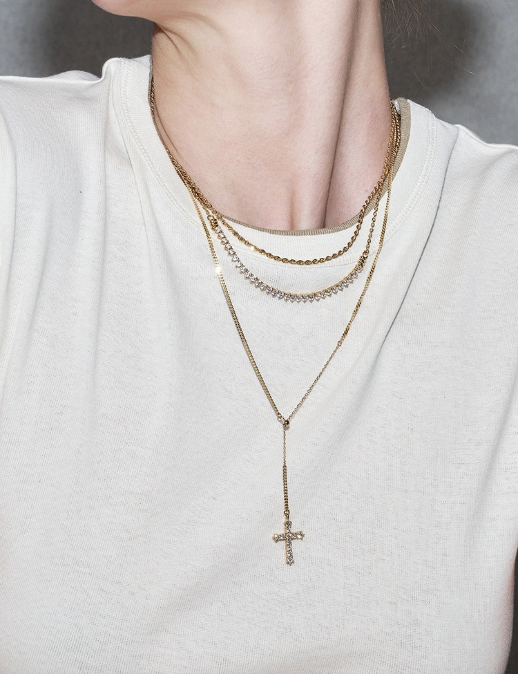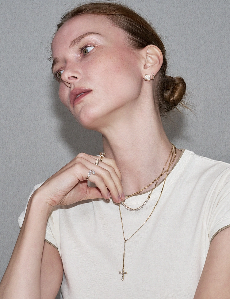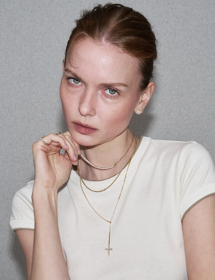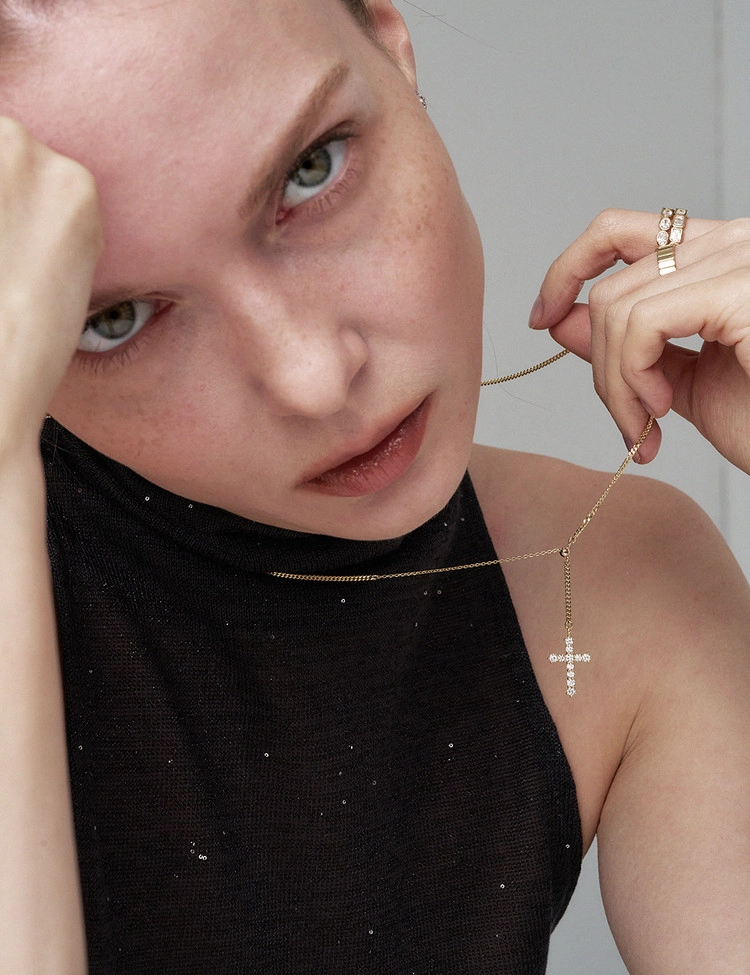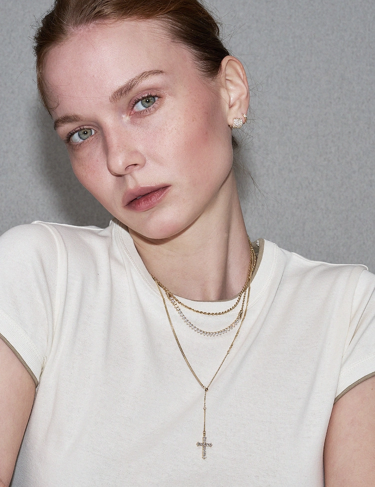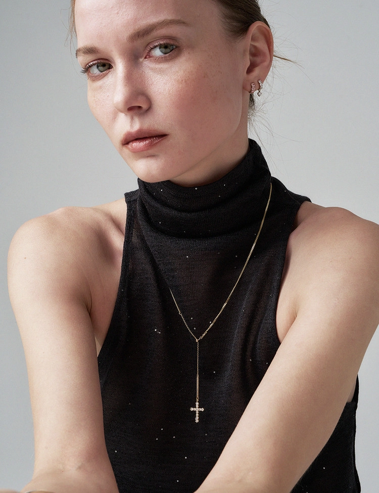 클래식한 십자가 라인을 따라 세팅된 11개의 2.5mm 안밖 라운드 랩다이아몬드로 장식한 것이 특징인 이 목걸이는 은은한 커브체인 광택과 우아한 Y자형 실루엣이 어우러져 가장 돋보이는 완벽한 드레스업 스타일을 연출합니다. 슬라이드볼로 길이 조절이 가능하여 만족도 높은 착용감을 선사하는 디자인입니다.