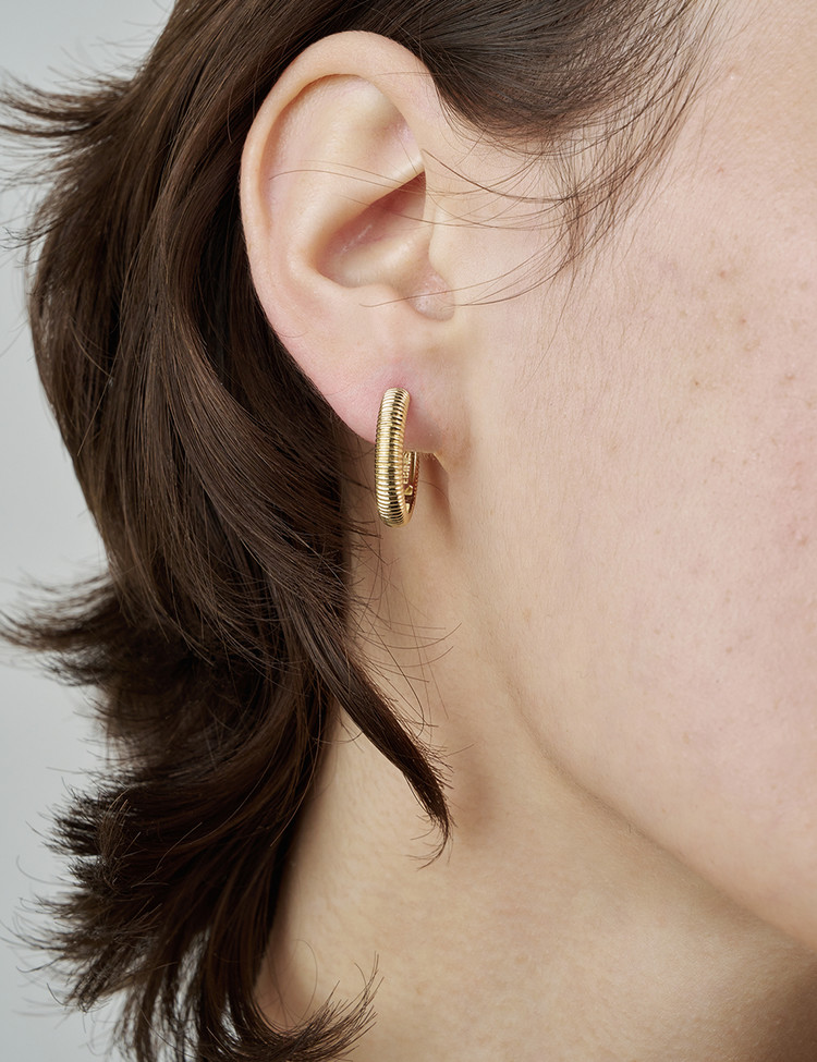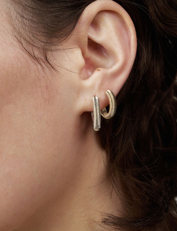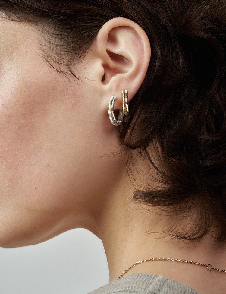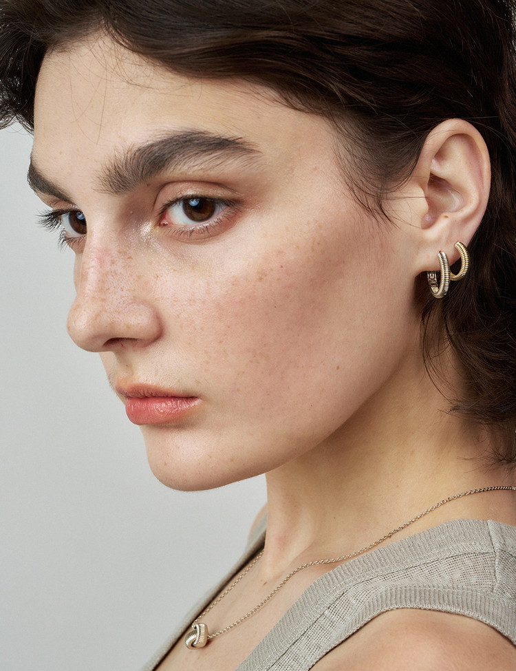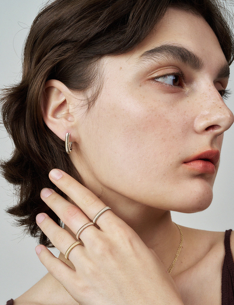 유려하게 밴딩된 라인을 따라 정교하게 패턴화된 리비드 컬렉션은 성별과 스타일의 경계를 넘어 모두에게 매력적으로 다가가는 이비니시 대표 시그니처 라인으로 자리매김하고 있습니다. 데일리하게 착용 가능한 후프 사이즈로 세심한 디테일 볼륨감을 더해 완성된 이 이어링은 캐주얼한 스타일에도 자연스럽게 스며들며, 시간이 지나도 변치 않는 클래식한 아름다움을 선사합니다. 특별한 날에 완벽한 선물을 쇼핑하세요.