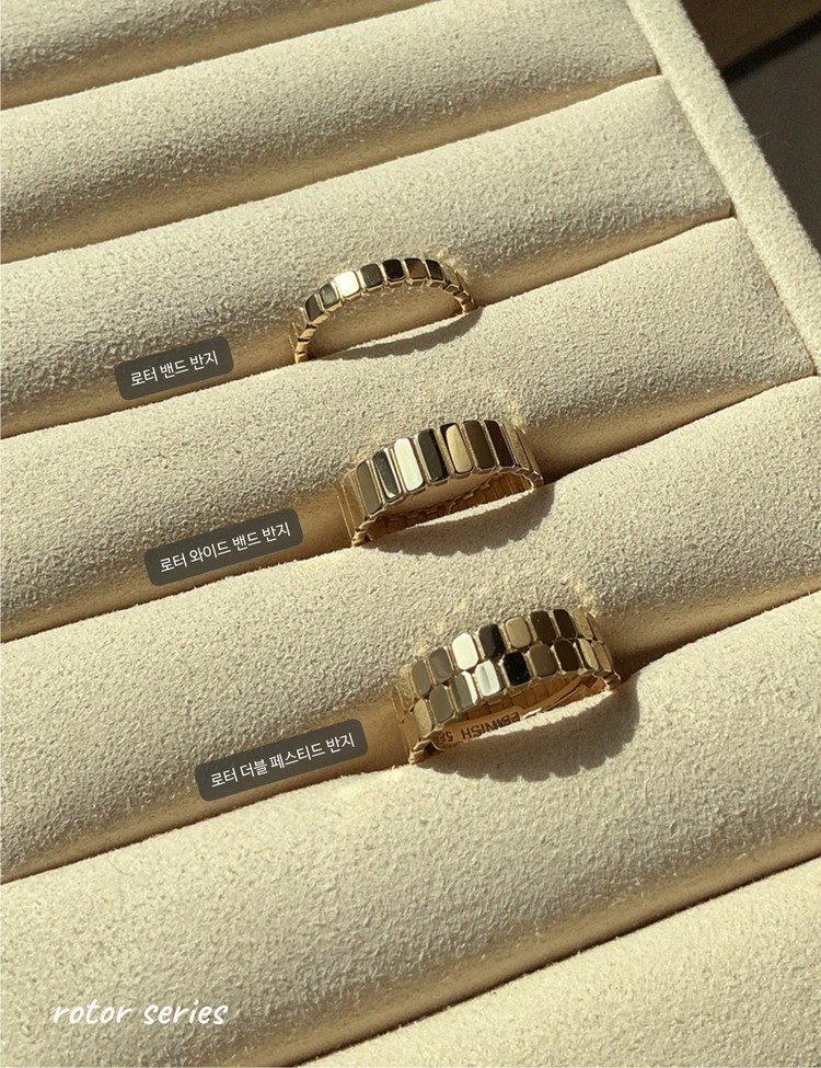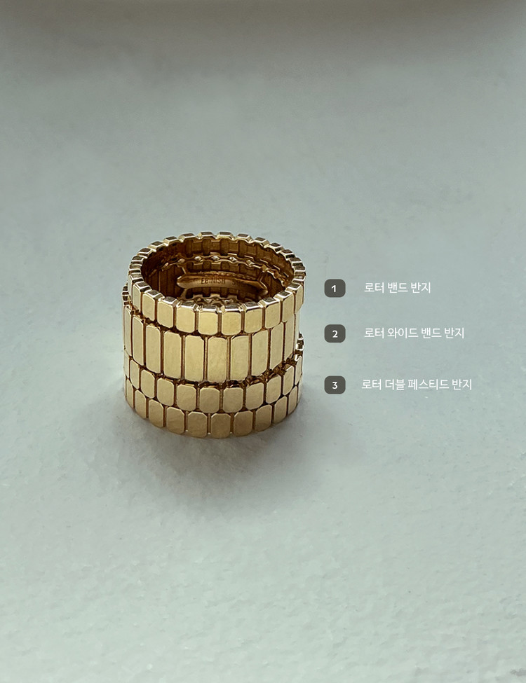 인더스트리얼 감각의 시크한 무드로 탄생한 로터(rotor) 컬렉션 두가지 라인으로 완성된 것 같은 착시효과를 주는 유니크한 페스티드 디자인으로 로터 컬렉션의 다른 링 제품들과 함께 연출해 좀더 과감한 메탈릭 스타일링을 마음껏 뽐내보세요.
