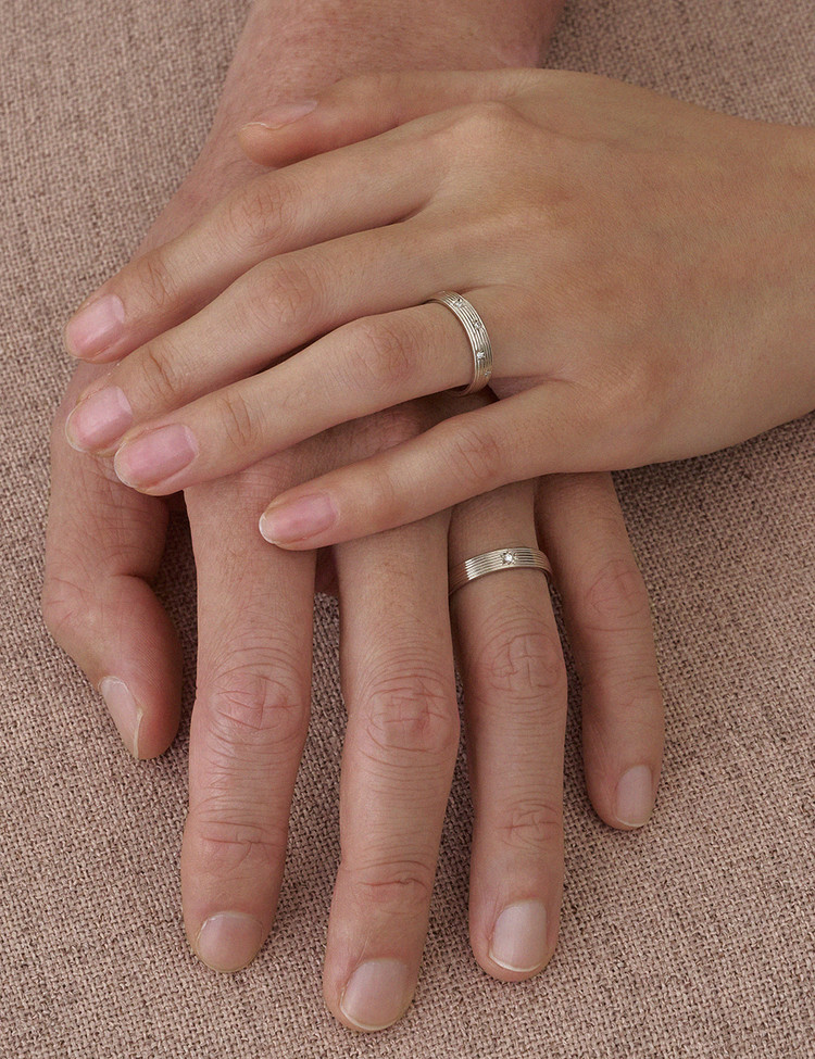 This wedding band series reflects the moment when two lines become one. The fine horizontal lines along the band symbolize a relationship taking shape. Each Lino ring shares the same language of “line,” finished with details that carry quiet meaning.