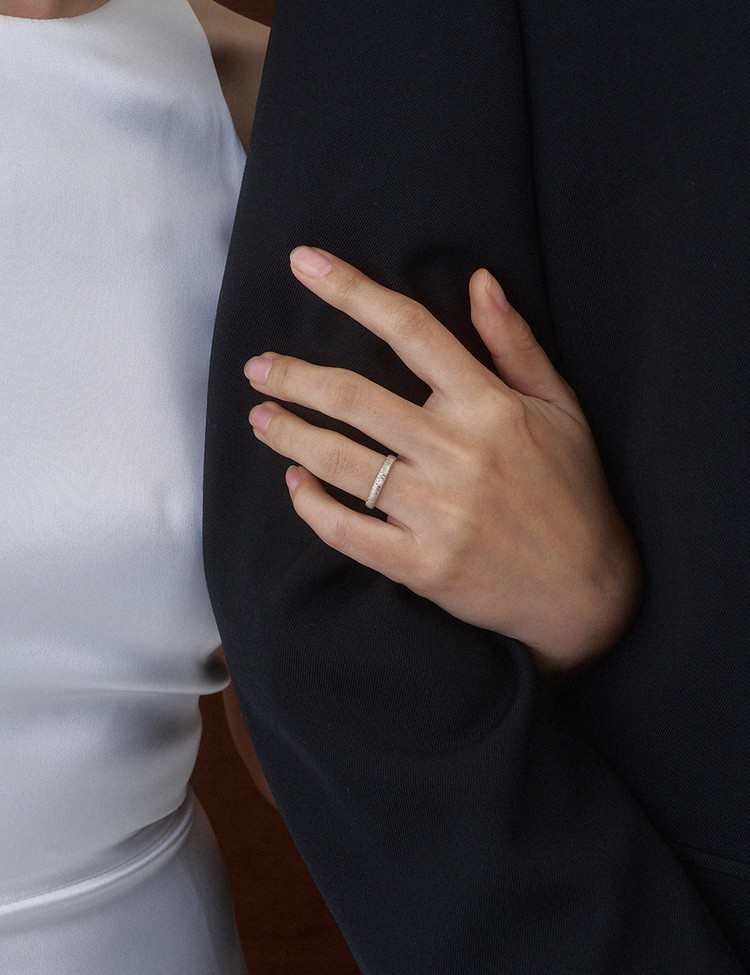 Inspired by light drifting across the sea and the calm texture of the coast. A hand-crafted surface reveals a soft, matte-like finish that feels gentle over time. Designed for everyday wear, this wedding band settles naturally into the rhythm of shared life.