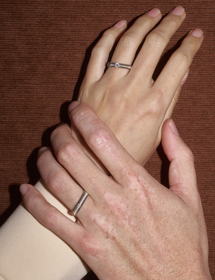 Ribbed mark는 시간을 따라 켜켜이 쌓인 사랑의 결에서 영감을 받아 두사람이 함께한 시간의 결을 담아 내었고, 밴드 위에 셋팅된 다이아는 네 가지 옵션으로 선택의 폭을 넓혔습니다. 또한 과감하게 셋팅된 0.2ct, 0.3ct 두 가지 캐럿 옵션은 스톤 셋팅 높이를 낮춰 예물스러운 과함을 없애도록 설계했습니다. 캐주얼 룩부터 포멀한 스타일링까지 자연스럽게 어우러지며, 일상 속에서도 부담 없이 착용할 수 있는 클래식한 균형을 완성합니다.