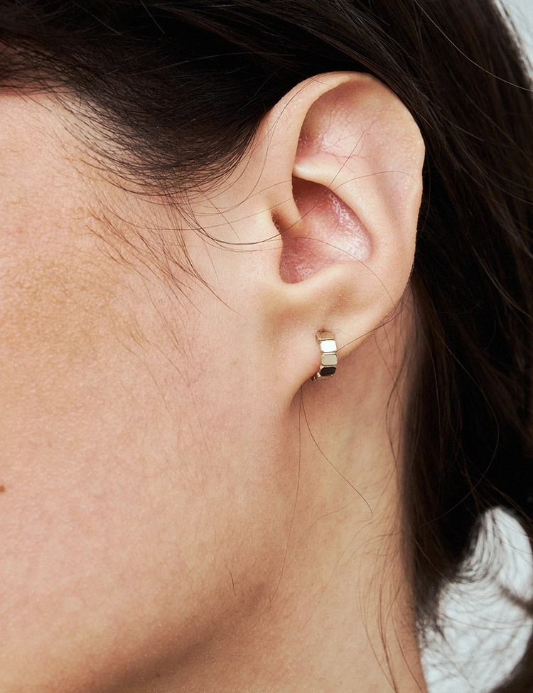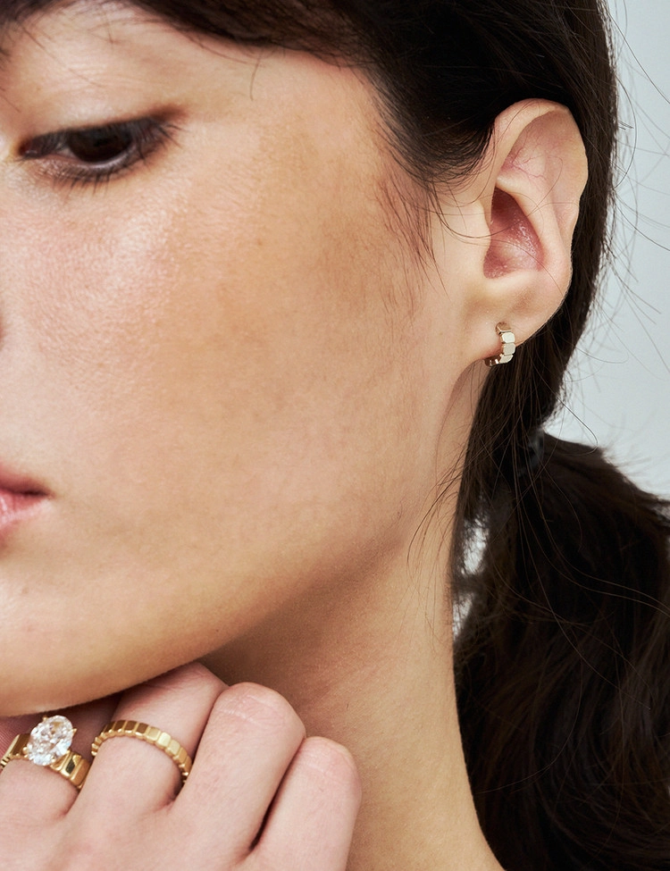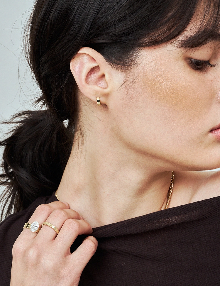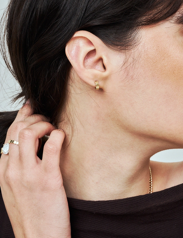 Born from an industrial-chic sensibility, the ROTOR Collection features square-edge banding and distinctive industrial patterns. This S-size hoop sits close to the ear—an easy everyday essential. Perfect as a second earring or layered with multiple piercings.