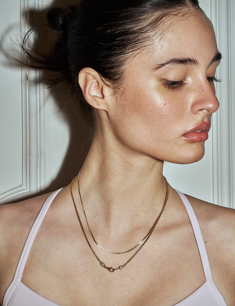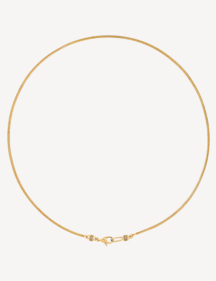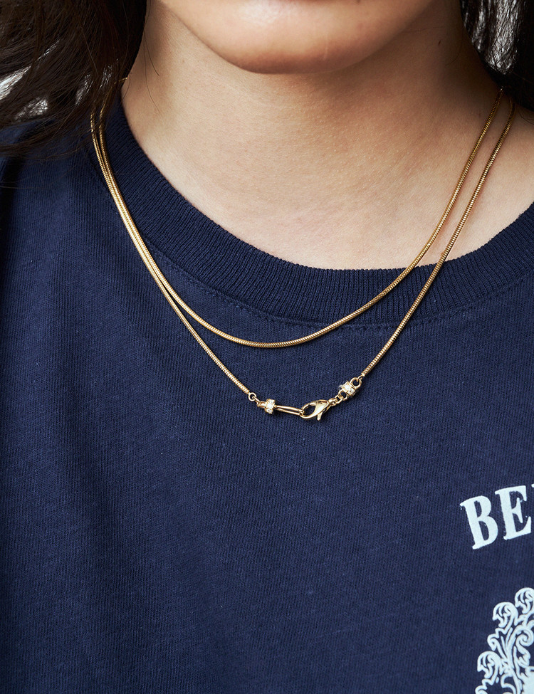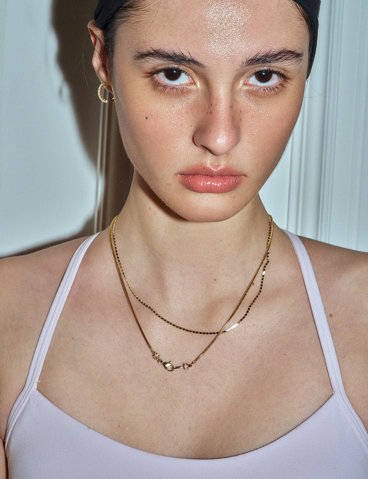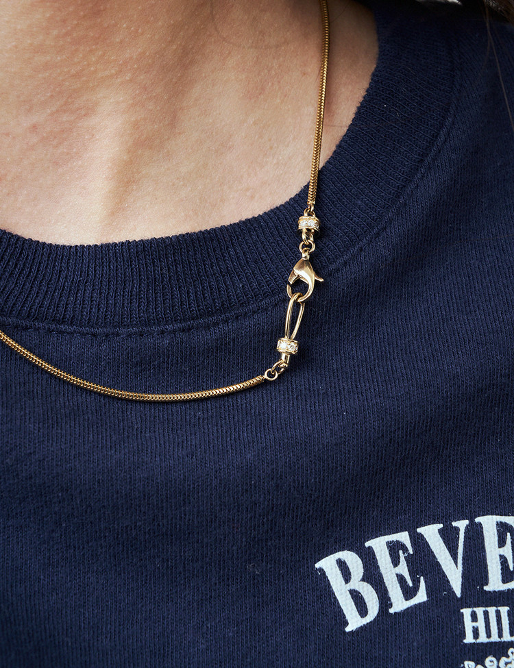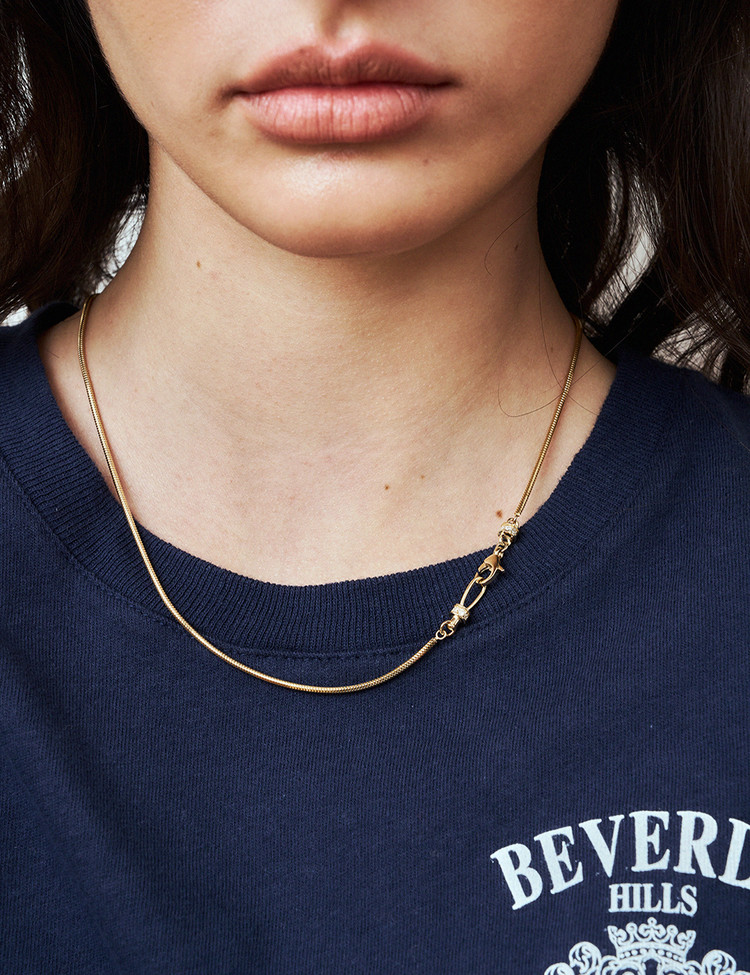 Crafted with ebinish’s signature motif, this necklace reinterprets the clasp and hook with a refined new design. Subtle chain variations let one accent transform the entire mood—perfect for minimal looks, and even better layered.