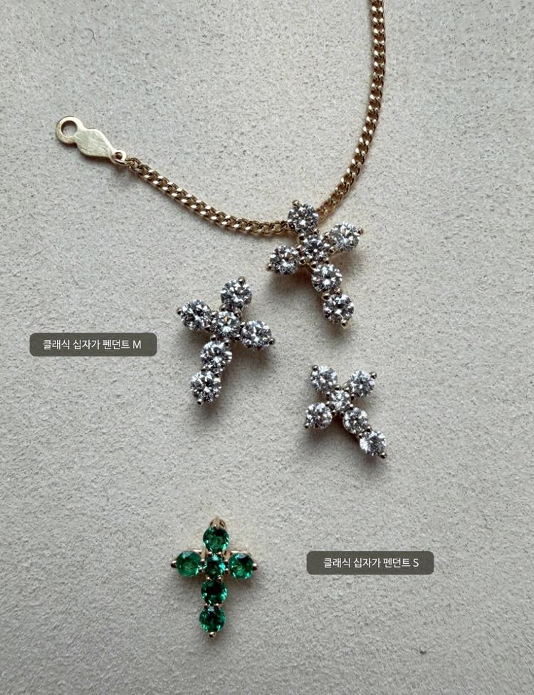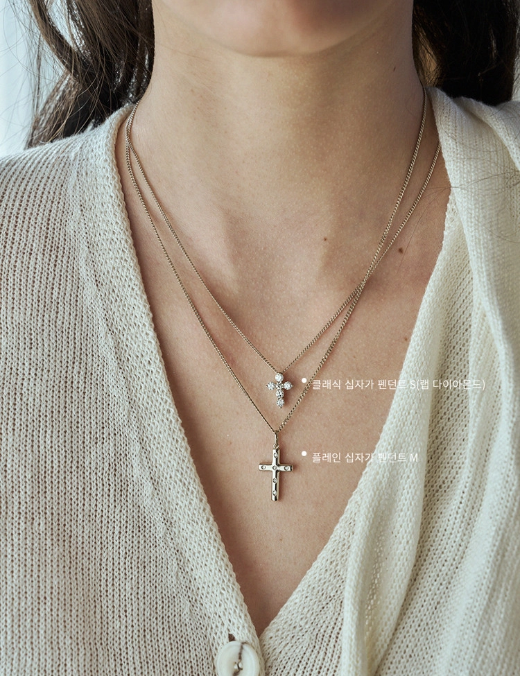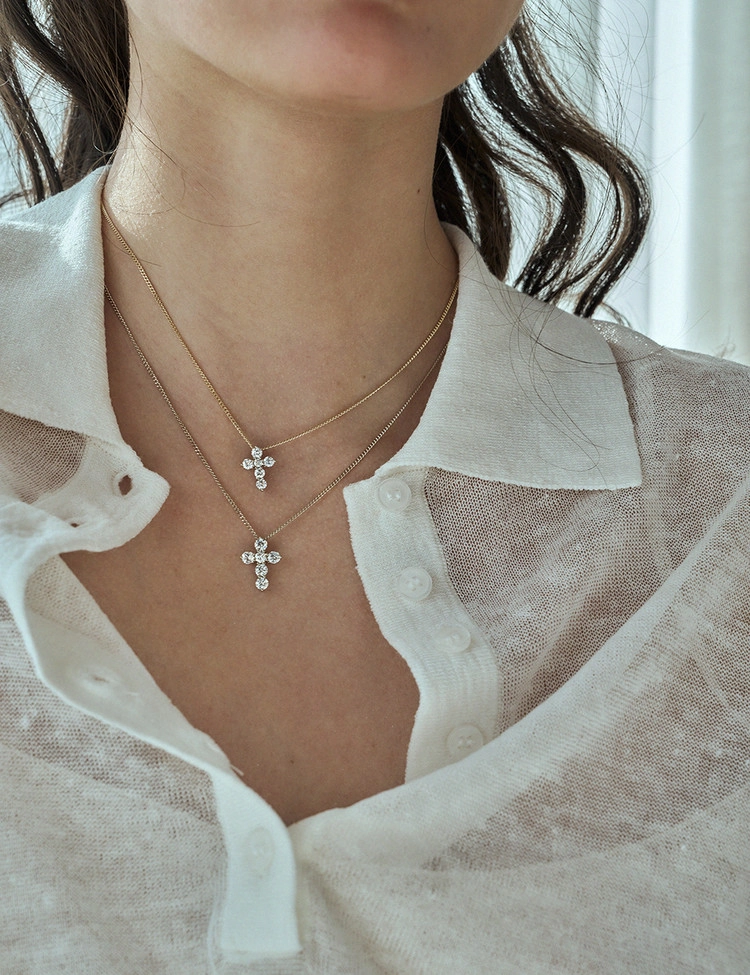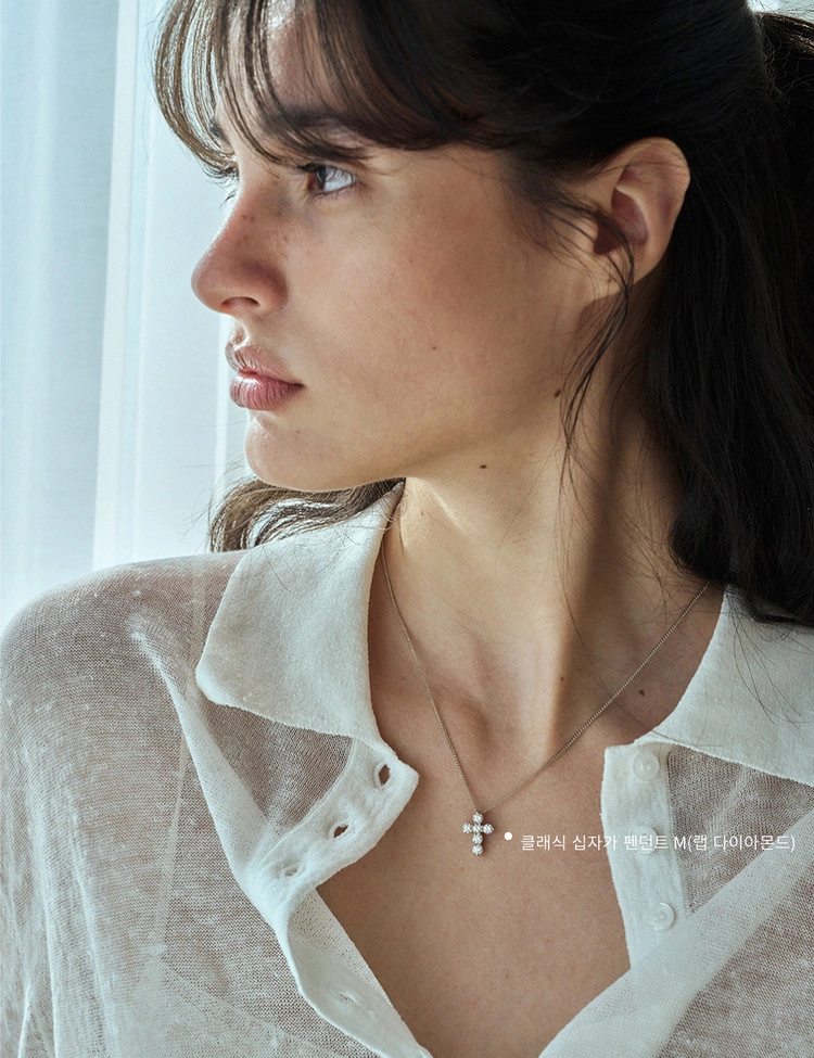 클래식 패밀리에서 탄생한 상징적인 십자가 펜던트 S/M 사이즈로 6피스, 총 0.5ct/1.0ct 의 랩다이아몬드가 세팅된 제품입니다. 정면에서 체인이 연결되는 고리가 보이지 않는 쉐입으로 다양한 체인과 깔끔하게 떨이지는 핏이 매력적인 디자인입니다. 단독은 깔끔하게, 레이어드는 한층 더 분위기 있게 완성되며 나 자신 위한 주얼리는 물론 사랑하는 사람을 위한 선물로도 잘 어울립니다.