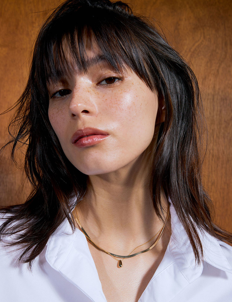 The 'flat herringbone snake chain' necklace has a seamlessly connected plate construction and is designed to fit perfectly into the neckline, boasting an excellent fit. It is a necklace that can match various points with a 3mm width volume.
