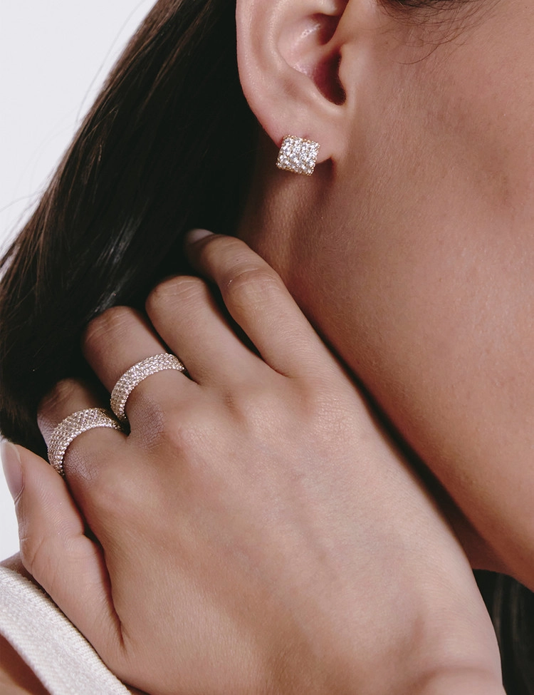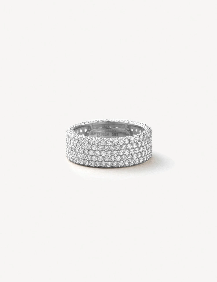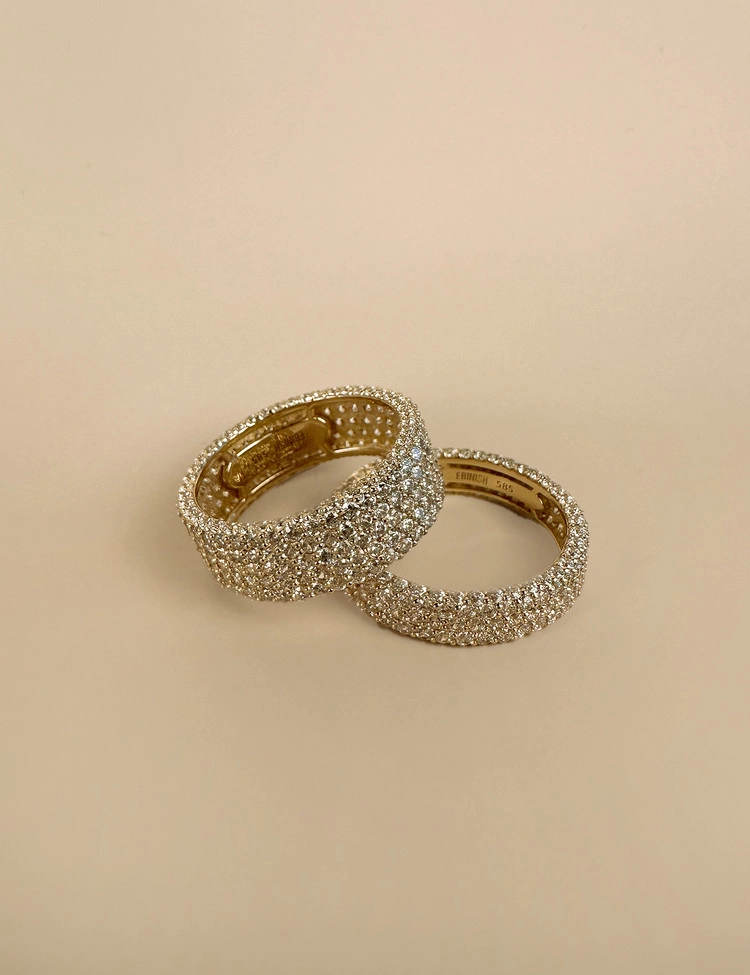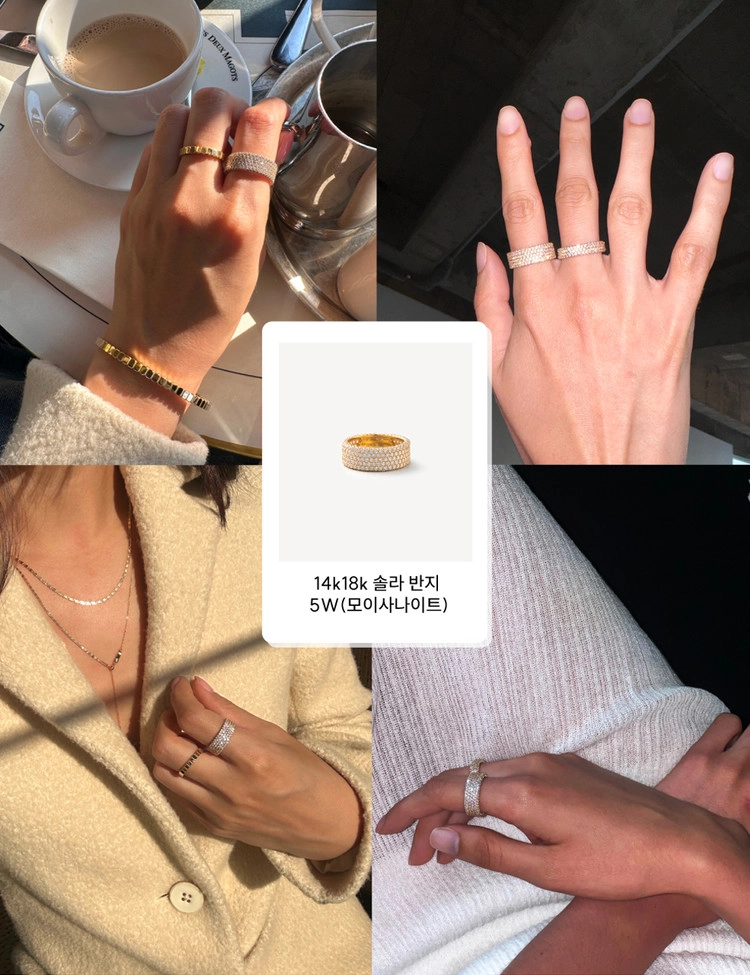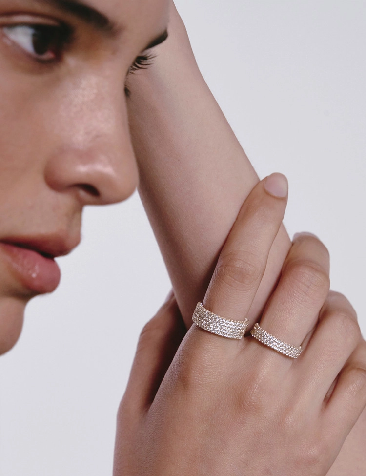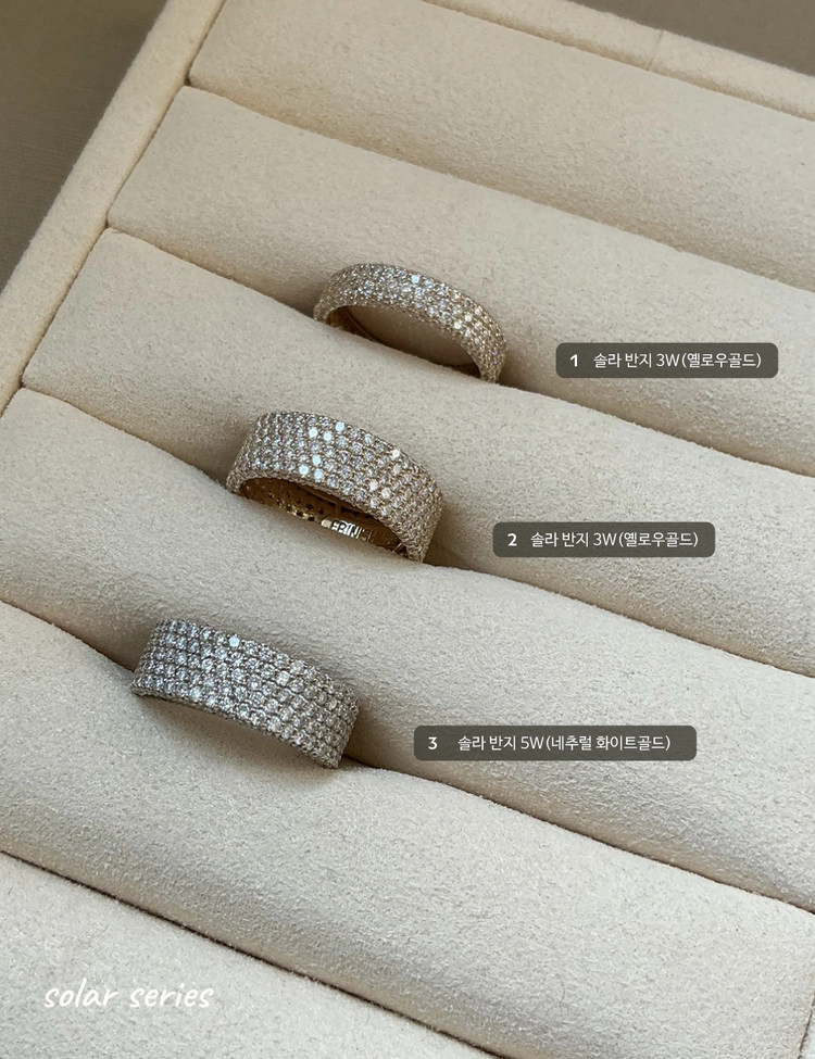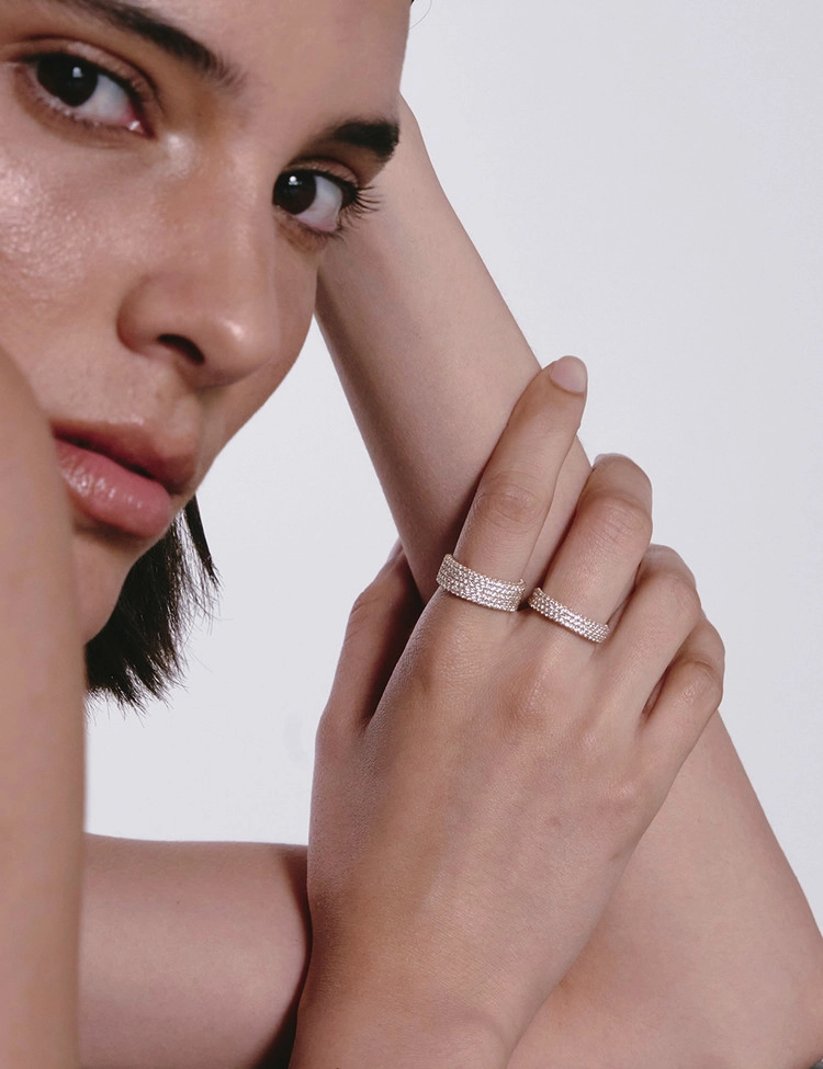 308여개 스톤을 파베 세팅해 화려한 반짝임을 만드는 360 올어라운드 스트랜드 솔라 링은 프레임 사이드까지 정교하게 세팅된 디자인이 특징이며, 일반 파베세팅 이어링 보다 더 우아하고 센슈얼한 룩을 완성할 수 있게 디자인 되었습니다. 이 링은 유행을 타지 않는 우아한 룩을 완성할 수 있다고 자부합니다.