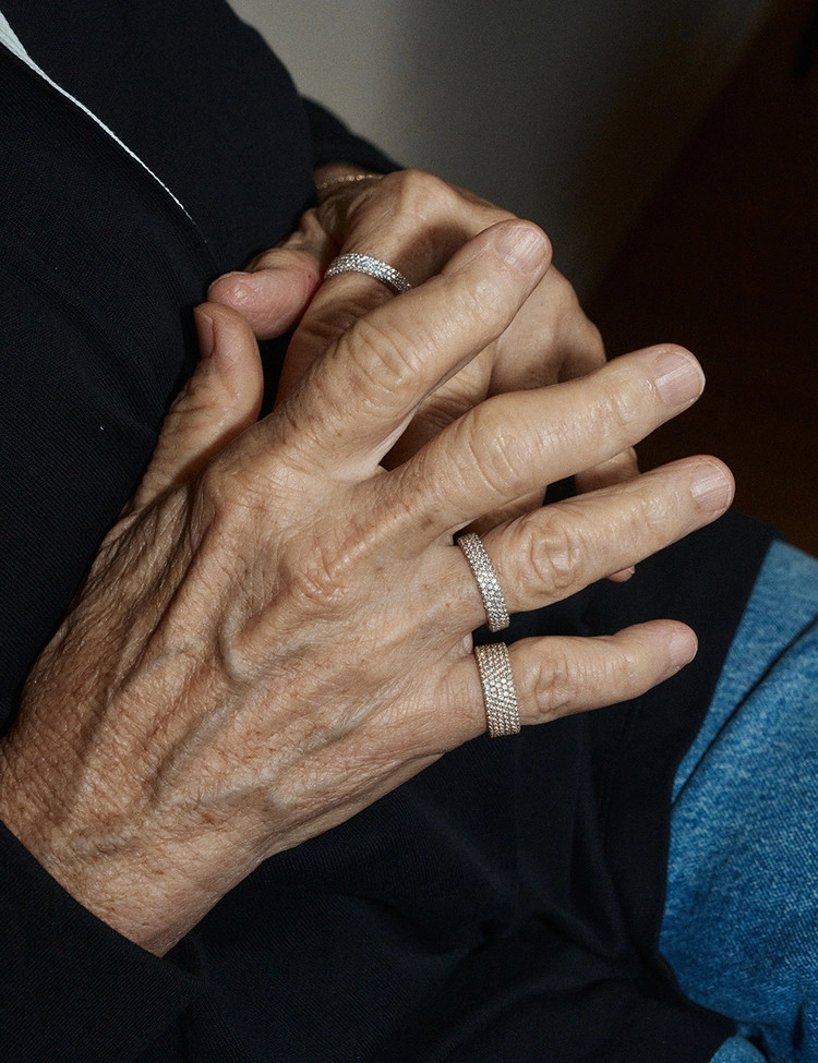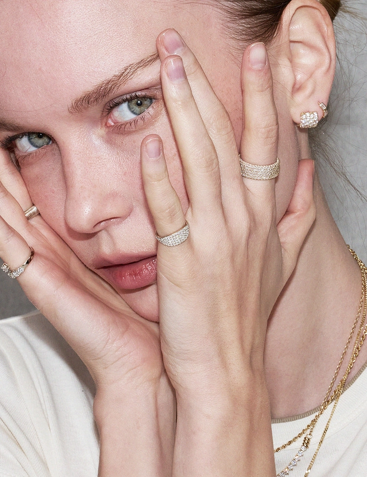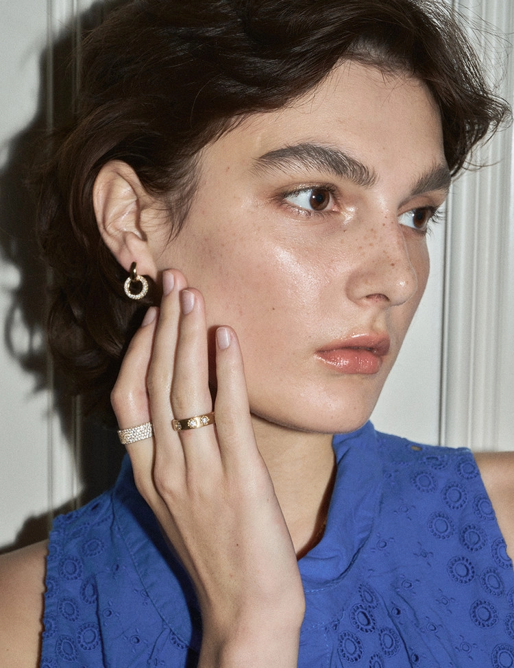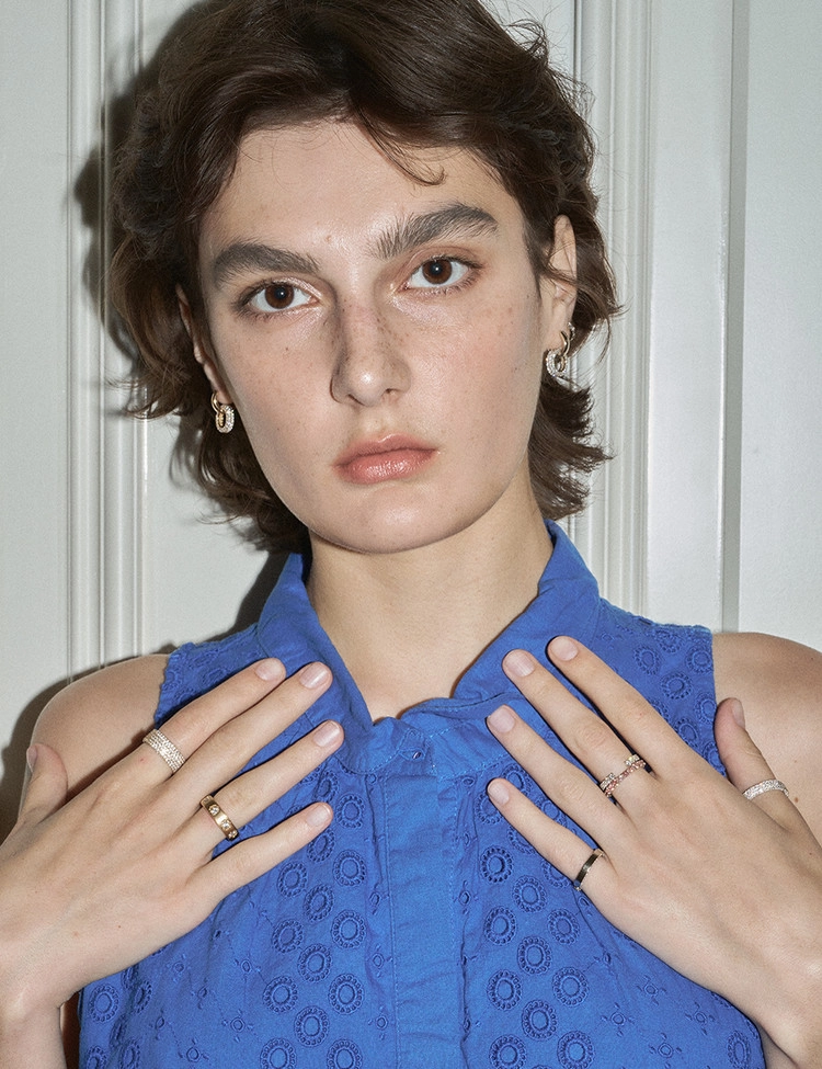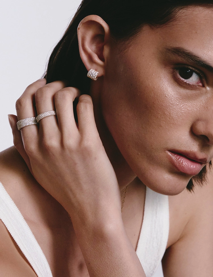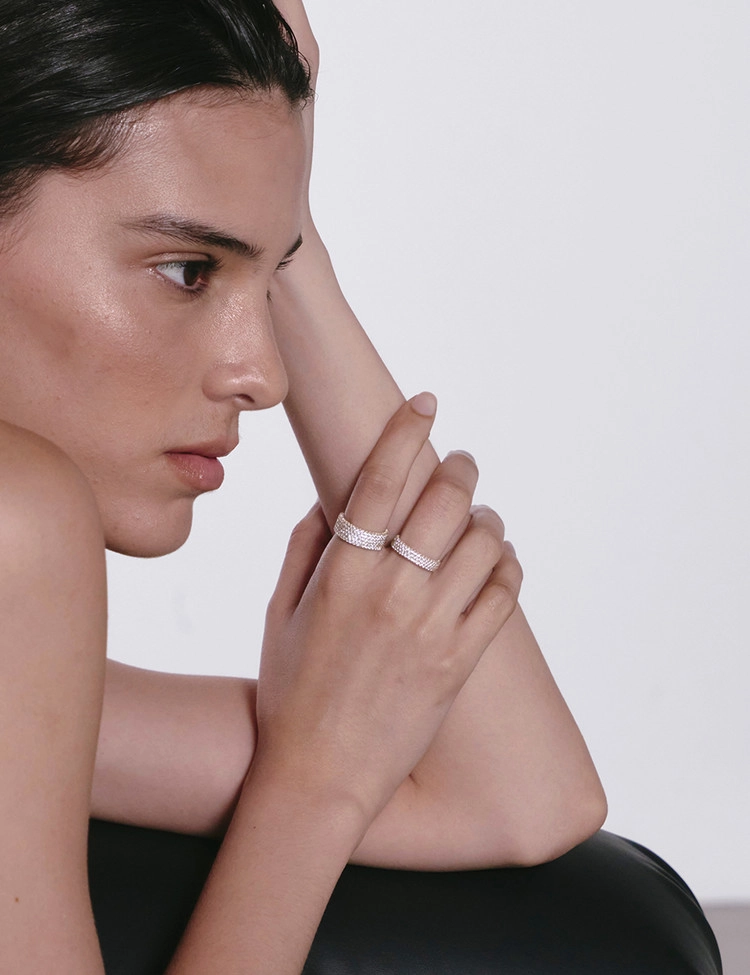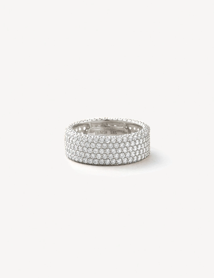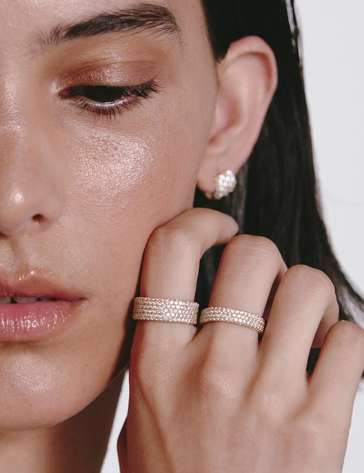 308여개 스톤을 파베 세팅해 화려한 반짝임을 만드는 360 올어라운드 스트랜드 솔라 링은 프레임 사이드까지 정교하게 세팅된 디자인이 특징이며, 일반 파베세팅 이어링 보다 더 우아하고 센슈얼한 룩을 완성할 수 있게 디자인 되었습니다. 이 링은 유행을 타지 않는 우아한 룩을 완성할 수 있다고 자부합니다.