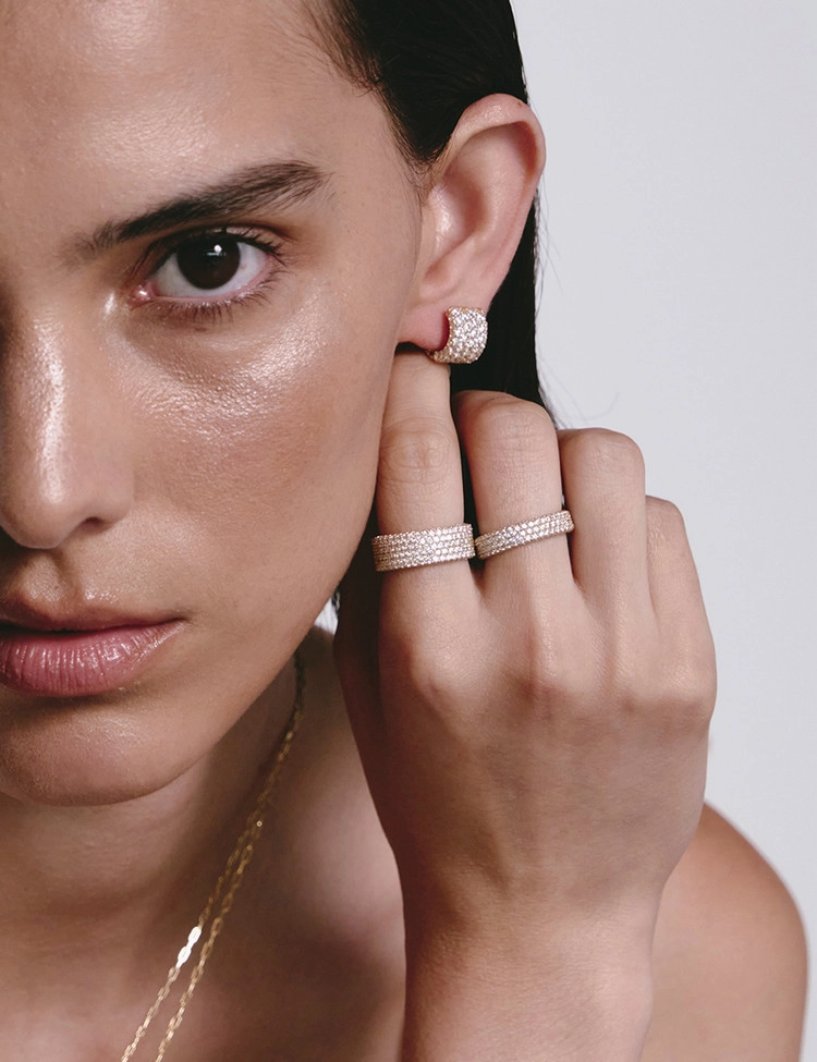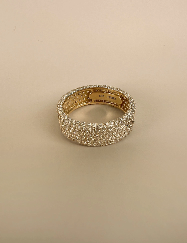 The 360 All-Around Strand Solar Ring, featuring over 308 stones in a pavé setting, creates a brilliant sparkle. Its design, meticulously set even on the frame sides, creates a more elegant and sensual look than typical pavé earrings. This ring is proudly designed to create a timeless elegant look.