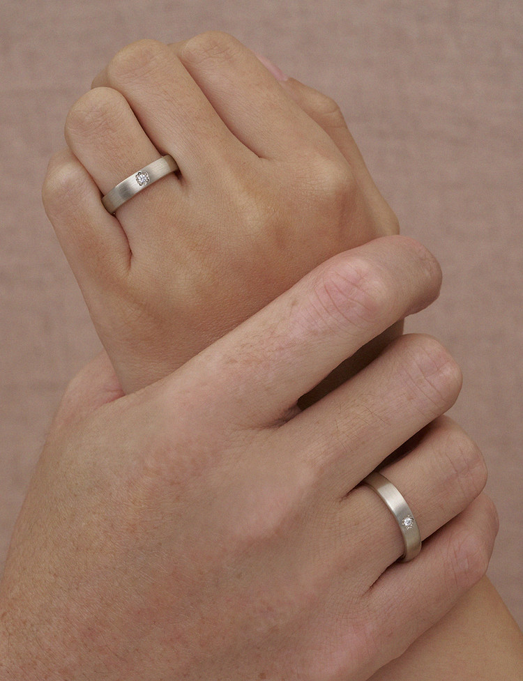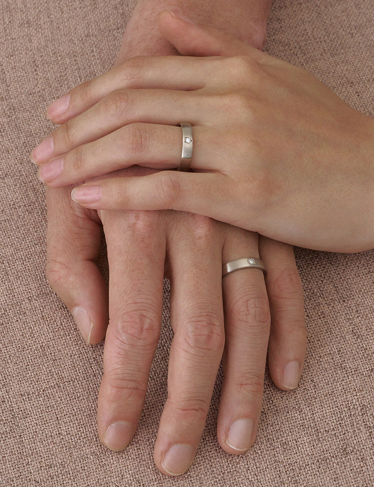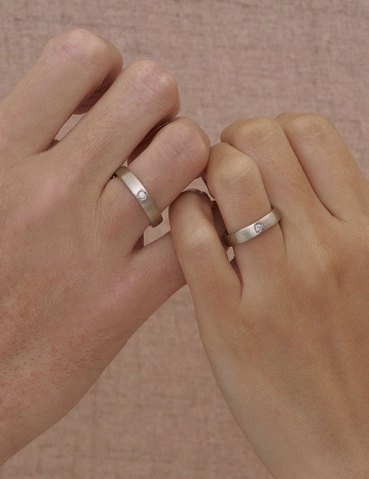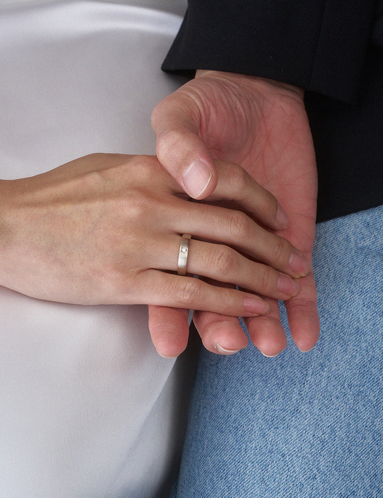 시간이 지나도 흐트러지지 않는 우아함, 관계를 지탱하는 강인함에서 출발한 웨딩밴드 라인입니다. 부드러움과 단단함이 공존하는 두사람의 사랑의 형태를 제안하며, 이비니시만의 핸드크래프트 스톤터치 기법으로 제작된 샬럿 밴드 링은 기계적인 광택이 아닌, 손으로 완성한 듯한 섬세한 결을 담고 있습니다.